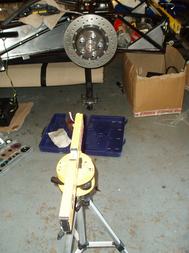 I construct a string box as described on the build CD to set toe in. I level the chassis and use a laser spirit level to set the string to run through the centre line of the hubs.