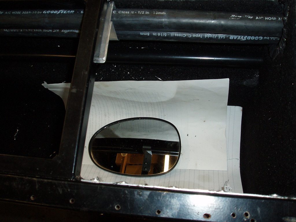 I secure the luggage containers with rivets to the chassis and then seal around the ends of the conduit with black RTV. Its a little bit fiddly to do a good job but you need to move the conduit to locate the containers into place. I fit the heater control valve and cable and then the aircon and heater hoses are secured in the luggage containers using the large ali P clips.I find that an old car wing mirror is useful for this job.