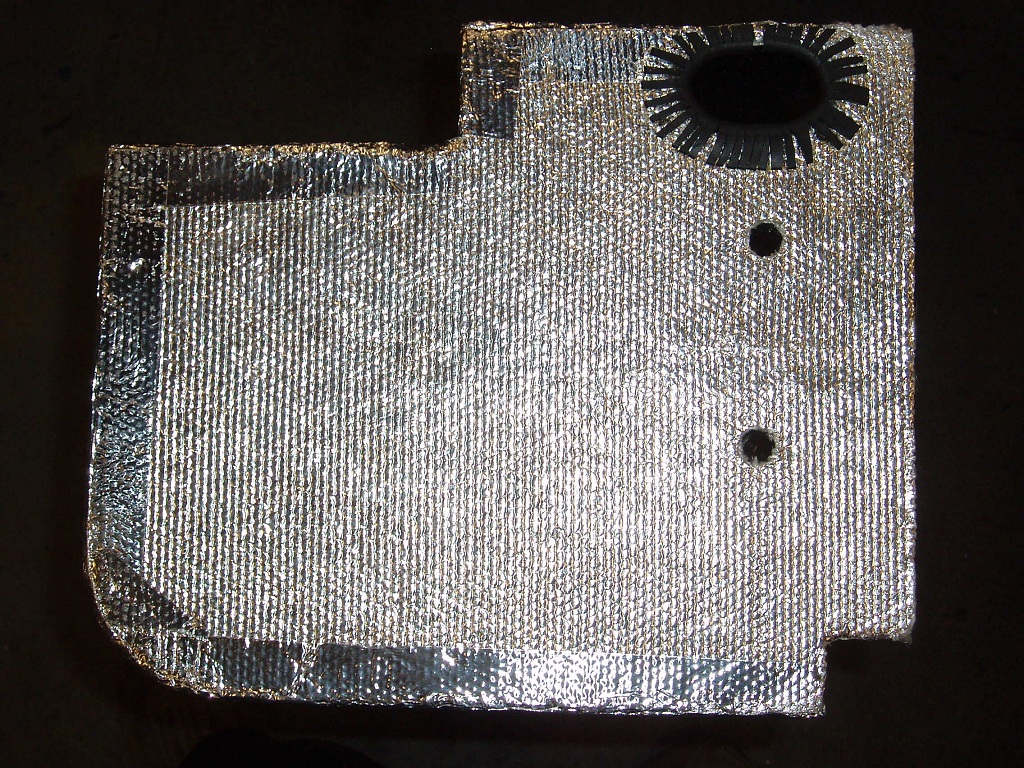 The outsides I have covered with heat reflective sheeting to reduce heat from the water pipes. All edges covered with metal tap to tidy them up. I protect the edges of the holes where the air confitioning and heater pipes pass through with a flexible grommet I sourced from Farnell. This has an adhesive layer that melts with a hot air gun. To get it to flex around the curves I cut slits, once in place a quick blast with the hot air gun secures it in place.