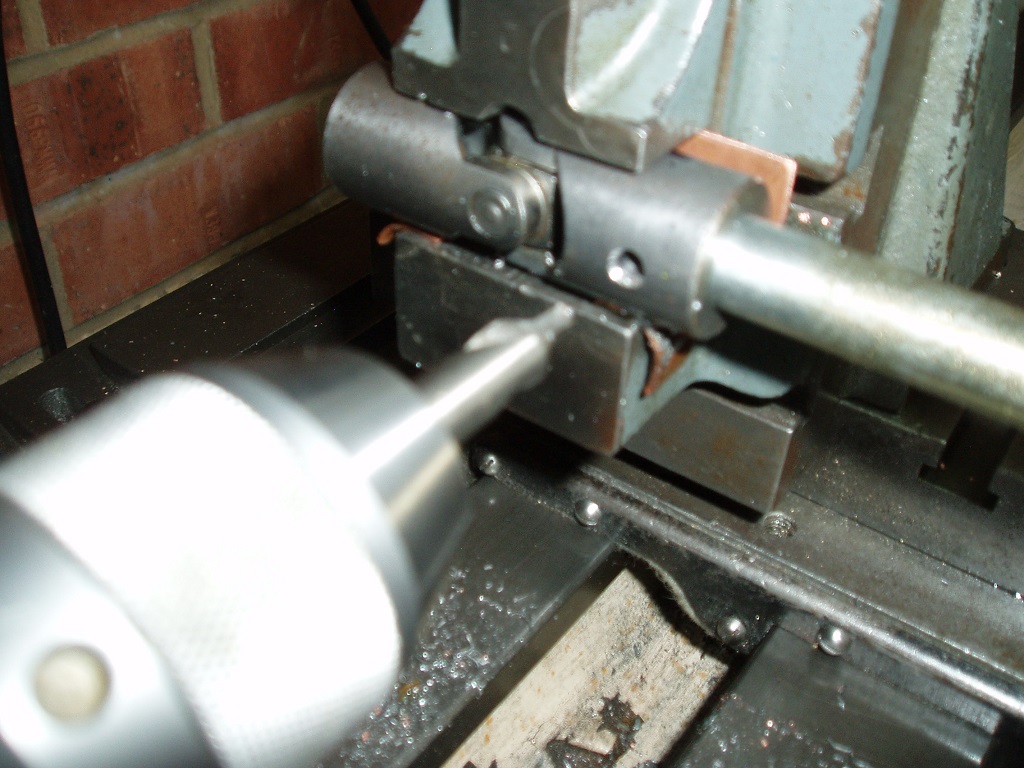 I make some copper shims from a piece of plumbing pipe to align the universal joints in the vice. Holes are started with a centre drill and then drilled through with a standard 5/32" drill bit. To enable easier insertion of the pins I use a centre drill to break the edge of the hole and provide a slight lead in.