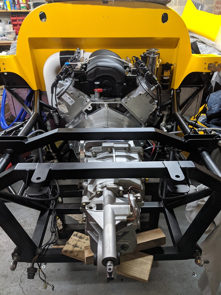 With the engine ready it is time for a first fit in the chassis and familiarise myself with space restrictions, plumbing etc. With the rear clip removed and no space in the shed I originally had built to store the body I present my challenge to the wife (reminding her that the reason the shed was 20 feet long was to easily store the body components). I assure her it will not be for very long so a home was found - she even helped me carry it in.