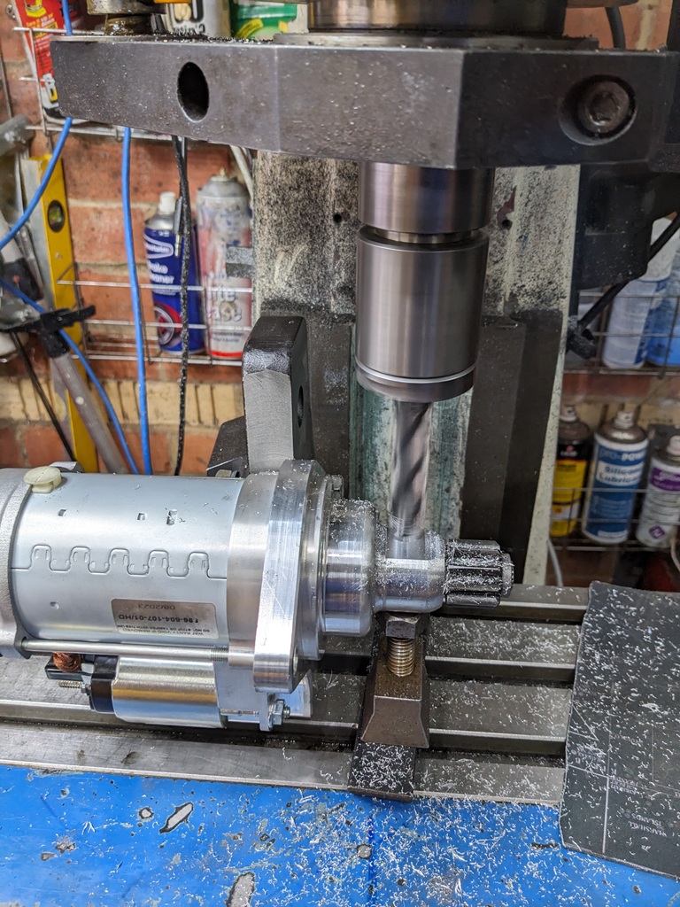 I make a bracket from a piece of cast iron salvaged from an old washing machine, this bracket was then secured to the mill table and the motor bolted to it. A machinist's jack was then used to support the shaft. I gradually mill a flat on the side until the housing undercuts the gear teeth.